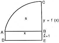es decir, la derivada de la abscisa de la superficie es función (u ordenada). Veamos la formulación de Newton. Biz y = f (x) curva y s = superficie (ABC) (ver figura), que se genera por el movimiento paralelo de la recta vertical BC. Biz x = AB y hagamos el paralelogramo ABED considerando AD = 1. Entonces x = superficie (ABDE), esta superficie es generada por el movimiento de la VE. La relación de velocidades de incremento de ambas superficies, según Newton, es igual a la relación BC y BE, es decir, s/x = BC/BE = f(x).