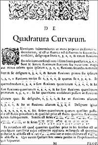 Newton medía todas las cantidades variables respecto al tiempo (más tarde dijo que el tiempo es cualquier cantidad que cambia uniformemente): eran fluentes. Las velocidades de cambio se denominaban flujos. Una curva laun es debida al movimiento de la abscisa y la ordenada y tanto x como y tienen sus flujos x e y. Dada la ecuación de la curva, se busca la relación entre los flujos. ¿Cómo lo conseguirá? Sustituir x e y por x + x o e y + y o en la ecuación de la curva para acortar la inicial, dividir por o y hacer 0 esta o. El método, además del estilo, es el actual, con la posibilidad de realizar una derivada implícita.