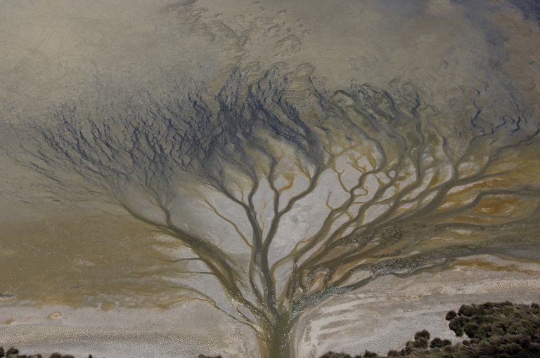 En esta foto se pueden ver los laberintos dibujados por el río Guadalete. Los colores oscuros son el reflejo de la actividad anaeróbica de las bacterias, mientras que los verdes intensos son colocados por las algas. Y los únicos indicadores de la escala, esos puntos blancos: las gaviotas.