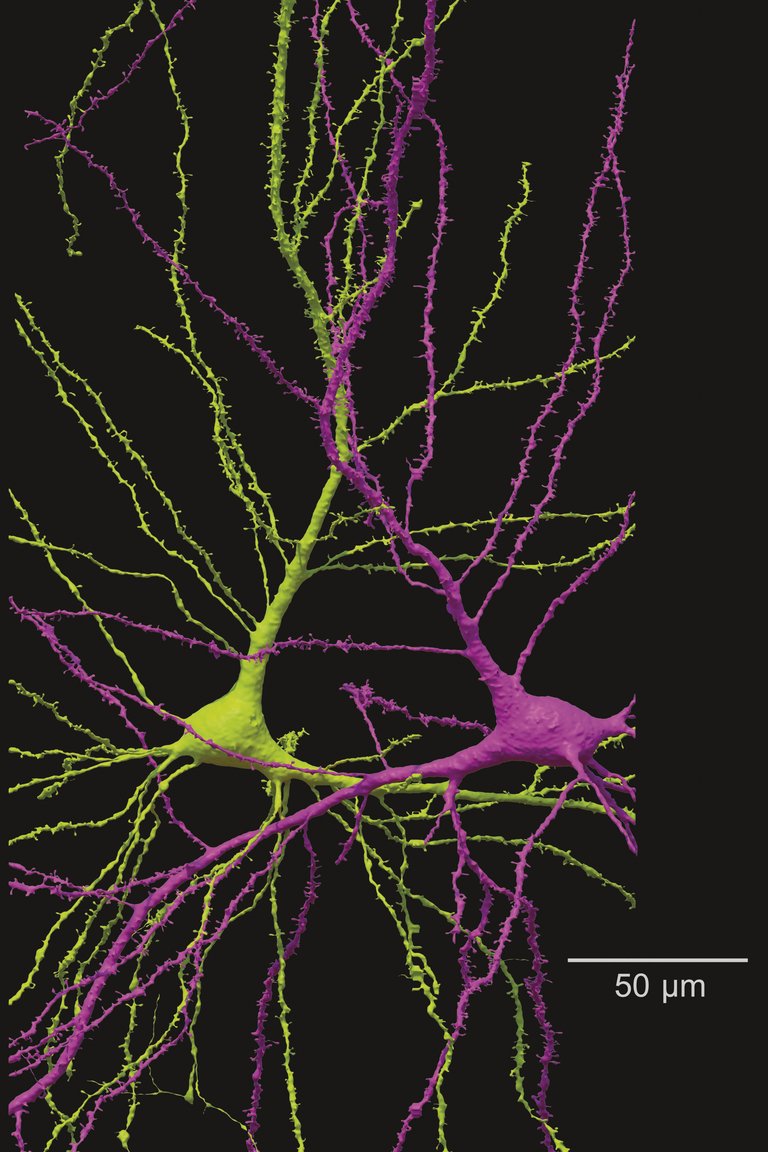 A partir d'una mostra d'escorça temporal, el model va ser obtingut a partir d'imatges de microscòpia electrònica i algorismes d'intel·ligència artificial. I van trobar estructures que mai havien vist fins ara, com a axons enroscats i conjunts d'axons connectats amb 50 sinapsi. La mostra era d'un pacient amb epilèpsia, i els investigadors no estan segurs de si aquestes estructures són patològiques o, simplement, excepcionals.