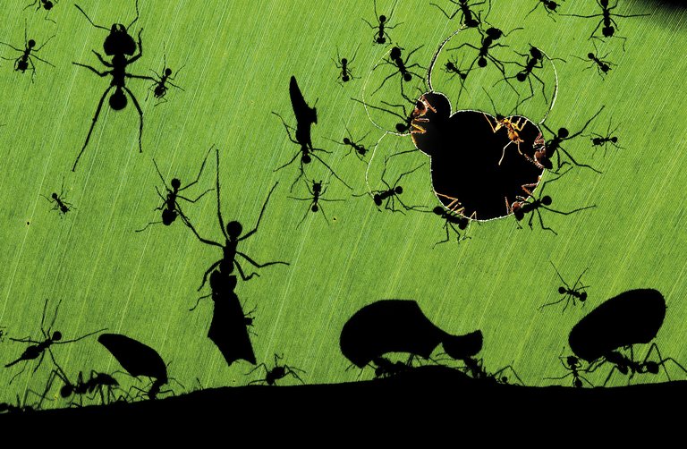 Le photographe hongrois Bence Máté a photographié dans une forêt tropicale du Costa Rica. Après des heures d'observation des fourmis, une nuit, il suivit une rangée de fourmis à travers la forêt. La rangée se ramifiait et chaque branche finissait sur la feuille d'un arbre ou d'un buisson. L'activité des fourmis était frénétique : elles coupaient et transportaient des feuilles de feu. Mettez le flash d'un côté de la feuille, de l'autre côté, allongez-vous sur le sol avec l'appareil photo, et là, la photo.