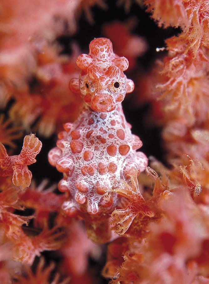 Itsas zaldi pigmeoa da liburuko beste protagonista bat. Arrain bitxi honek zentimetro pare bat baino ez du neurtzen, eta kamuflajean izugarri trebea da. Izan ere, kolorez aldatzeko gaitasuna du: argazki honetan, esaterako, inguruan duen gorgoniaren kolorea hartu du.