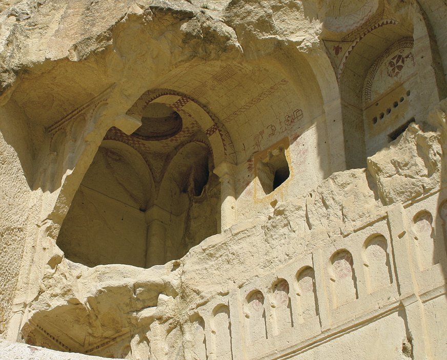 Gizakiak ere aprobetxatu ditu lurralde honetako haitzulo eta koba naturalak. Kristauek, hititek eta bizantziarrek monasterio, kapera eta eliza ugari antolatu zituzten arroketan. Ezagunetako bat “Eliza Iluna” da. Argi-gabeziari esker, X. eta XI. mendeetako freskoak beren horretan mantentzen dira.
