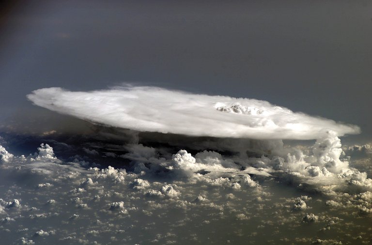 Au-dessus de l'Afrique, au-dessus, se trouve ce cumuloninbo. Comme le nom latin cumulonimbus l’indique, ce sont des nuages hauts et denses qui accumulent la pluie (nimbus) (cumulus). Ils ont une grande extension verticale et la surface s'étend souvent comme une enclume, aplatie. Là-dessous, c'est la tempête.