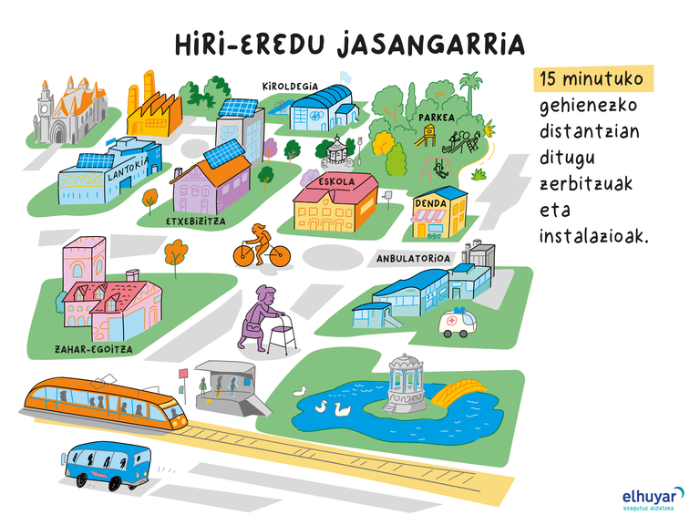 Mais pour que cela fonctionne vraiment, il faut fuir la structure dispersée des villes et suivre la règle des 15 minutes. Maintenant, les quartiers ne sont pas autonomes et complets: les gens viennent au centre pour se socialiser, pour acheter à des centres commerciaux extérieurs et pour travailler plus loin. Une autre façon de vivre plus durable est celle d’une ville organisée par des quartiers, où des gens dans un rayon d’un kilomètre et à une distance maximale de 15 minutes ont des commerces, des centres de santé, des écoles, des centres de travail, des centres sportifs, des activités culturelles, des espaces naturels… De sorte qu’ils puissent aller à pied ou à vélo. Cela réduirait le trafic et la pollution des voitures, améliorerait la santé, réduirait la consommation d'énergie urbaine et améliorerait la qualité de l'air.