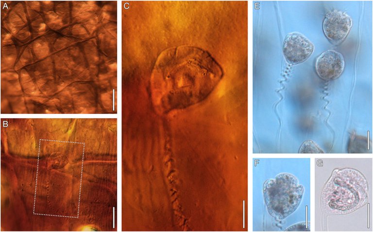Lur-zizareek eta izainek arrautzak kapulu baten babesean jartzen dituzte. Kapulua egiteko materiala likido-egoeran jariatzen dute, eta gogortu egiten da gero. Hain zuzen ere, anbararekin gertatzen den moduan, tranpa horretan harrapatuta gelditu zen ziliatu fosil hau; Triasikoko izain batek jariatutako kapuluan. Fosilak 25 µm-ko gorputza eta txortena ditu, eta, barruan, ferra-itxurako nukleoa ikus daiteke; gaur egungo Vorticella ziliatuen ezaugarri ber-berak ditu.
