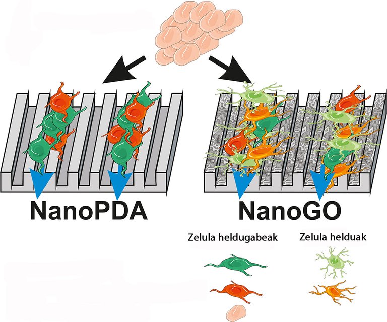 In the field of neural tissue engineering, in recent years there has been a great need to develop materials that allow the differentiation of stem cells and their conversion into neurons. Researchers from the UPV-EHU have created bioabsorbent elastomeric scaffolds that can be useful: the new supports present an ordered nanostructured topography, a kind of acanalation that allows cell growth, while the surface has worked with graphene oxide. The use of new supports has shown that cells grow faster and, instead of dispersing randomly in all directions, as in other cases, grow aligned, which researchers can lead in the desired direction.