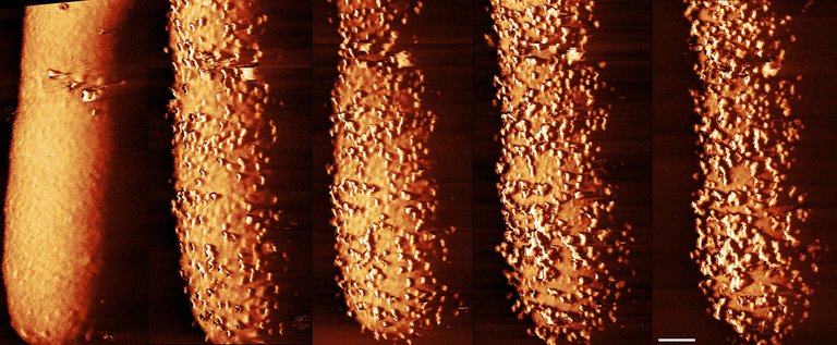 Polimixina antibiotikoak E. coli bakterioen armadura nola suntsitzen duen ikus daiteke goiko irudian. University College London eta Imperial College Londoneko ikertzaile batzuek, indar atomikoko mikroskopia erabiliz lortu dute lehen aldiz ikustea hori nola gertatzen den. Nanometro gutxi batzuetako zabalera duen orratz bat bakterioaren azaletik pasatuz, argia erabiliz posible izango litzatekeena baino askoz bereizmen handiagoko irudiak lortu dituzte. Irudi horiek erakutsi dute polimixinak minutu gutxitan protuberantzia batzuk sortzen dituela bakterioen azalean.