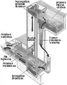 Izokinak saldotan ibiltzen dira. Presara inguratzen direnean ur azkarragoko korronte batek erakarriko ditu 'eta igongailuaren ahora erakarriak izango dira. Hortxe hamar minutuero burdin sare bat itxiko da eta arrainak 3m3-ko bolumena duen ontzi batean harrapatzen ditu. Ontziak arrainak barruan dituelarik gora egiten du eta 22 m gora egin ondoren arrainak ibaira eramango dituen ubide batean utziko ditu.