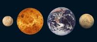 Los otros dos planetas, la Tierra y Venus, son más grandes y tienen atmósfera. El viento solar llega a Venus con más fuerza que a la Tierra, ya que es el planeta más cercano al Sol tras Mercurio. Sin embargo, es capaz de mantener la capa gaseosa que la rodea. Su atmósfera es muy compacta —no es posible ver la superficie de Venus vista desde la Tierra—, está formada mayoritariamente por dióxido de carbono, y la presión superficial de este planeta es muy elevada, unas 90 veces mayor que la de la Tierra —no es de extrañar que las sondas allí enterradas sólo hayan sobrevivido unas pocas horas antes de que se destruyan las presiones—.