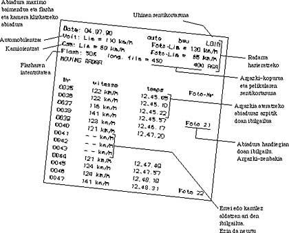 Radarra funtzionatzeko prest dago jadanik, baina horretarako radarra bera gutxi gorabehera abiadura konstantez desplazatzea komeni da. Pentsa dezagun 100 km/h-ko abiaduraz doala. Beste automobilek radarra pasatzen dutenean, kasu hauek egon daitezke: 110 km/h baino abiadura txikiagoan pasatzea, 110 eta 130 km/h bitarteko abiaduran pasatzea eta 130 km/h baino abiadura handiagoan pasatzea. Lehen kasuan radarrak ez du ezer adierazten. Bigarren kasuan, abiadura automobilaren panel ondoko koadroan agertu bakarrik egiten da (ikus irudia) eta 130 km/h-ko abiaduratik gora flasha eta argazki-kamera kliskatu egiten dira. Azken kasu honetan kalkulagailuak argazki-pelikulan grabagailu elektroluminiszentearen bitartez eguna, ordua, abiadura eta argazki zenbakia grabatzen ditu.