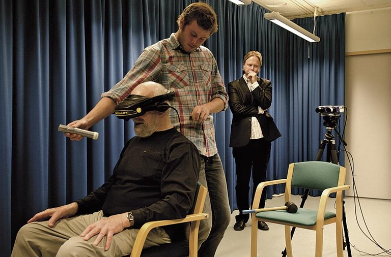 Hiru besoren jabe izateko sentipena eragiteko esperimentua. Irudia: Kjell Erlandsson/Karolinska Institutua.
