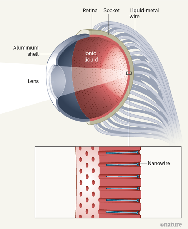 All this has to imitate an artificial eye, and as we said this week there is an article in the journal Nature. Scientists from Hong Kong have made a very advanced artificial eye with incredible technology. The retina is a semisphere of various materials (form that captures light well), with a perovskate hemispherical network, whose sensitivity is key. This artificial retina has small pores in which nerves, nanohilos are connected. They are made up of liquid metals capable of passing the light signal received and returning to its initial state in 24 milliseconds.