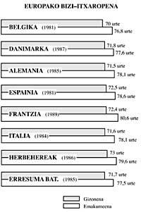 Bestalde, gizonezkoen bizi-itxaropenik hadiena Herberetakoa da; 73 urtekoa, hain zuzen ere. Europako beste herrietan ere oso antzekoa da bizi-itxaropena.
