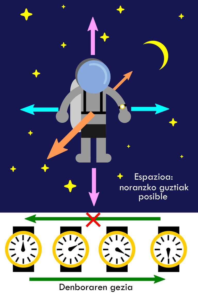Hori argitzeko, konpara ditzagun aipatutako bi magnitude fisikoak. Espazioari dagokionez, hiru dimentsio ditu, eta bi noranzko daude horietako bakoitzean: ezkerra eta eskuina, alde batetik; aurrea eta atzea, bestetik; goia eta behea, azkenik. Gure ikuspegitik, gora edo behera joatea ez da gauza bera, grabitateak behera bultzatzen baikaitu. Ñabardura hori alboratzeko, gure planetatik urrun dagoen astronauta bat irudika dezakegu (1. irudia). Egoera horretan egongo bagina, unibertso osoa edukiko genuke gure begien aurrean, eta edozein norabide eta noranzko hartzeko gai izango ginateke, inolako mugarik gabe.