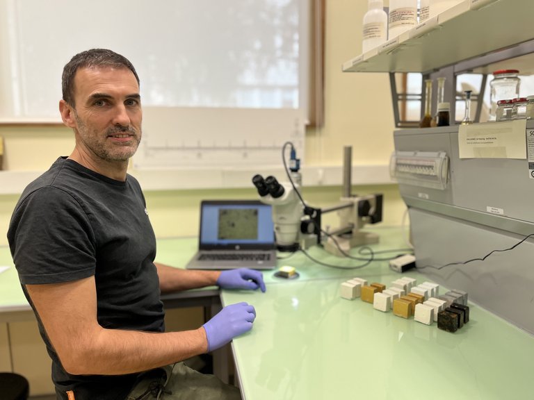 En revanche, les restaurateurs sont conscients qu'avec le temps les peintures utilisées auraient vieilli en raison de facteurs environnementaux. C'est pourquoi Larrañaga a essayé de connaître l'évolution future des peintures à utiliser. "Nous avons acheté les peintures des maisons commerciales et les vieilles expérimentalement pour voir combien de temps ils duraient et comment ils vieillissaient." Il ne suffit pas, cependant, d'être durables, ils doivent aussi être esthétiques parce qu'"ils ont aussi une fonction esthétique". C'est votre thèse de doctorat: prendre des échantillons, analyser leur évolution et voir ce qui peut être le plus approprié le jour de demain.