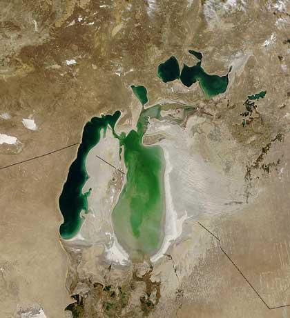 Naciones Unidas ha afirmado que la desecación del mar Aral ha sido el principal daño ambiental causado por el hombre. El mar no se ha secado del todo, pero ha perdido el agua suficiente para desdoblar lo que era un solo mar y el secado no ha quedado. Para dar la vuelta a la situación, el Banco Mundial concedió un préstamo al Gobierno de Kazajstán en la década pasada y ahora le dará una segunda. El mar Aral empezó a secarse porque no le llegaba el agua; los soviéticos desviaron las dos fuentes principales, los ríos Sir Daria y Amu Daria. Desde entonces, el agua desviada se ha utilizado principalmente para el riego del algodón de Kazajstán y Uzbekistán, base de la economía de estas dos repúblicas. Con el primer préstamo otorgado por el Banco Mundial al Gobierno de Kazajstán, de 65 millones de dólares, se redirigió el río Sir Daria, que actualmente lleva el agua al mar de Aral, en la parte norte del mar. Además, se mejoraron los sistemas de riego y se repartieron los tramos norte y sur con la construcción de un embalse, medidas que tuvieron gran éxito. A corto plazo, el tramo norte comenzó a recuperar agua. El Banco Mundial ha concedido un segundo préstamo al gobierno de Kazajstán, superior a los 128 millones de dólares. El Gobierno está investigando cuál es la mejor manera de utilizar este dinero, supuestamente la parte norte tiene la posibilidad de recuperarlo por completo. Pero la mayor parte del mar Aral es del sur, y para recuperar el mar Aral es necesario recuperar también la parte sur. Para ello hay que conseguir que los ríos Sir Daria y Amu Daria vuelvan al mar todo el agua que vertían en el mar Aral. En la foto se ven las dos partes del mar Aral. El norte se asemeja a tres lagos entrelazados, con agua verde oscura, casi negra. El del sur está formado por dos largos lagos, unidos entre sí; el ibón izquierdo es verde oscuro y, como se ve el fondo marino, el verde del lago derecho es más claro. La foto data de 2003 (desde entonces la parte norte ha aumentado y la del sur ha disminuido). La línea negra que se ve representa la frontera entre las dos repúblicas. Imagen: ANDÉN
