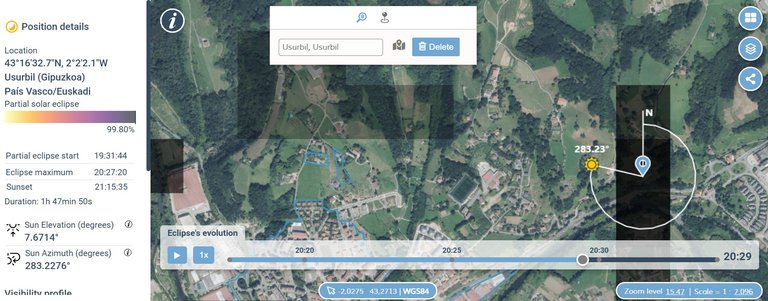 Eklipsea nondik ikusi planifikatzeko erreminta oso erabilgarria da. Izan ere, eklipsea iluntzean izango da, Eguzkia jada baxu dagoenean. Hartara, eklipsea ondo ikusteko, garrantzitsua izango da mendebaldean ikusgarritasun ona duen tokia aukeratzea.