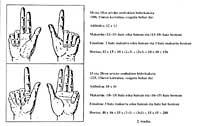 Esate baterako, 5 eta 10aren arteko bi zenbaki biderkatzeko, esku batean biderkagai bat eta 5en arteko diferentzia adina hatz jaisten zuten; beste eskuan, ordea, biderkagaia eta 5en artekoa. Emaitza, bi eskuetan jaitsitako hatz-kopurua bider hamar (buruz) eta bi eskuetan jaitsi gabeko hatz-kopuruen biderkadurari batuz lortzen zuten (1. irudia).