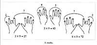Bitxikeria gisa 9 zenbakiaren biderkaketa-taula eskuz emango dugu. Bi eskuak gure aurrean zabalduz, ezkerretik eskuinera, hatzei 1, 2, 3, ... balioak eman eta gero, biderkagaitzat 9 duen biderkadura kalkulatzeko beste biderkagaiak adierazten duen zenbakiari dagokion hatza makurtu eta emaitza hatz horren alde bakoitzean geratzen diren hatz-kopuruek emango digute; ezker aldekoak hamarrekoak eta eskuinaldekoak unitateak (3. irudia).