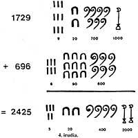 zituzten (4. irudia). Gero ikur berdinak bildu eta ordena bateko 10 ikur hurrengo ordenako ikur batez ordeztuz lortzen zuten emaitza.
