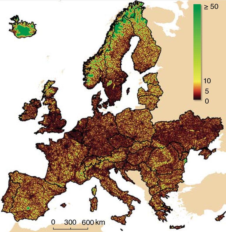 PNAS zientzia-aldizkarian argitaratu dute ikerketa, eta, haren arabera, Europako lurralde ez urbanizatuaren erdia errepide edo trenbide batetik 1,5 km-ra dago, eta laurdena, 500 metrora. Garraio-azpiegituren dentsitate handiena Europa erdialdean dute, eta txikiena, aldiz, Islandian.