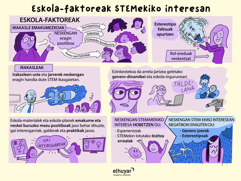 A més dels factors individuals, els escolars també influeixen en l'interès de les noies pels STEM. Cal deixar de costat les tendències de gènere i els estereotips i, en primer lloc, centrar-se en les dinàmiques de gènere de l'escola. També en materials escolars. A més, atès el professorat, les professores influiran positivament en les noies. Així, per exemple, serà recomanable ser professora dona en l'assignatura de tecnologia. Les seves actituds també influiran directament. D'altra banda, caldrà trencar estereotips falsos i models de rol, posant damunt de la taula a científics referents femenins.