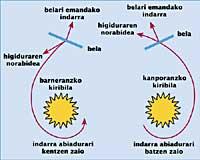 Argia ez da uhin hutsa; gogoratu de Broglie! Fotoiek partikula gisa ere jokatzen dute. Beraz, argiak ispilu-izaerako gainazal batean jotzen duenean, fotoiak islatu egiten dira, pilotak pilotalekuko paretan egiten duen maneran. Prozesu horretan fotoiek mugimendu-kantitate bat transferitzen diote gainazalari. Oso-oso txikia da, baina, fotoi-talka amaigabearen ondorioz, gainazala aurrerantz higitzen hasten da. Gainazal horrek bela baten moduan jokatzen du, finean.