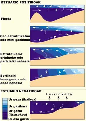 En funció de la salinitat es distingeixen dos tipus principals d'estuaris: positius i negatius (veure gràfic superior). L'aigua dolça que penetra en els estuaris positius, en ser menys densa que la salina d'aigua, es dirigeix superficialment cap a la mar, barrejant-se amb l'aigua marina que es desplaça del fons cap a l'interior. Per això, les aigües de major salinitat es troben en el fons exterior i les aigües de menor salinitat en la superfície interior. Quan l'evaporació en l'estuari és major que l'entrada d'aigua dolça, es produeix un estuari negatiu, ja que en augmentar la salinitat i la densitat a causa de l'evaporació, l'aigua superficial s'enfonsa i es dirigeix cap a la mar. Aquest tipus d'estuaris només es troba en els tròpics.
