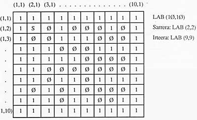 Labirintoa, matrize baten bidez seinalatuko dugu. Oztopoak "1" batez adieraziko dira eta libre dauden gelaskak "Ø" batez.