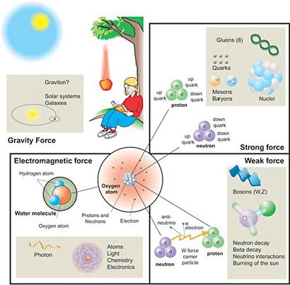 Agerikoena grabitatea da guretzat: planetak eta galaxiak berak indar horren arabera mugitzen dira, eta nola ez, baita gure inguruko objektu makroskopikoak ere. Baina gainerako indarrak materiaren maila oinarrizkoagoetan bereizten dira gehien. Esaterako, indar elektrikoak atomo-barruko elektroien eta protoien arteko elkarrekintzan parte hartzen du, eta, beraz, atomoen eta molekulen arteko erreakzioak bideratzen ditu. Aurten Nobelaz saritutako ikerketek are maila txikiagoetan azaltzen diren indarrak aztertu dituzte, eta behar-beharrezkoak gertatu dira naturako indar-mota guztiak bateratzeko proiektu horretan.