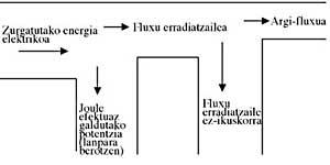 Lanpara elektrikoaren kasuan, zurgatutako energia elektrikoaren zati bat bero bihurtzen da zuzenean (lanpara berotu egiten da), beste zati bat energia erradiatzaile bihurtzen da (uhin elektromagnetikoen bidez igortzen dena) eta beronen zati txiki bat da argi-energia, hau da, giza begian argi-sentsazioa eragiten duten 350 mm-etik 760 mm-era bitarteko uhin-luzerak.