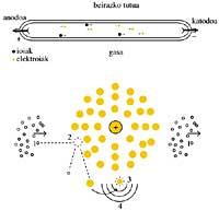 Baina atomo guztiak ez dira disoziatzen. Disoziatu gabeko atomo eta elektrodo positiborantz doazen elektroien artean talka gertatzen den bakoitzean, elektroi berriak askatzen dira atomoetatik talkaren eraginez. Elektroi berri hauetako batzuk anodorantz abiatuko dira gainerako elektroiekin batera, baina beste batzuk berriz ere asoziatu egingo dira beraiek lehen zeudeneko atomoekin. Talkaren ondorioz atomoaren orbitatik (edo energi mailatik) atera diren elektroiak –elektroi kitzikatuak–, lehen zeudeneko orbitara (edo energi mailara) itzultzen dira eta sobera duten energia uhin-luzera jakin bateko erradiazioa igorriz askatzen dute. Fenomeno horri luminiszentzia deritzo, edo, zehatzago esanda, elektroluminiszentzia. Berau, gas eta lurrinek daukaten propietatea da. Ondokoan datza: karga elektrikoek kitzikatzen dituztenean erradiazio elektromagnetikoa, argia barne, igortzean.