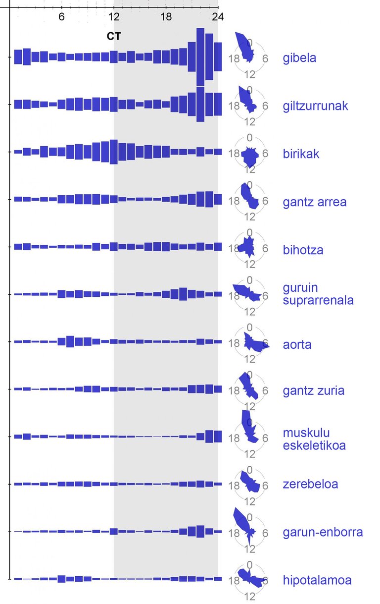 Bost urtez aritu dira Pennsylvaniako ikertzaileak saguen genomaren espresioaren ordutegia ikertzen. Ikusi dute proteinak kodetzen dituzten geneen %43k erritmo zirkadianoren bat duela. Oro har, egunsentia eta ilunabarra baino lehen espresatzen dira gehien geneak, baina ikusi dute gorputzeko organoaren arabera desberdina dela erritmoa. Esaterako, gibelean eta giltzurrunetan arratsaldeko seietatik aurrera dira aktiboen geneak, eta biriketan eguerdian.