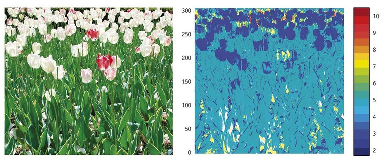 Erretinaren ereduak zelula ganglionar multzo bakoitzak sortzen dituen informazio-kanalak konbinatuz irudi baten koloreak kalkulatzen duen sistema bat definitu dugu. Horretarako CIECAM02-k (Comission Internationale de l'Eclairage 2002 urtekoa) proposaturiko koloreen atributuen kalkuluetan oinarritu gara. Asmatutako sistema eta CIECAM02a lotuz sistema bioinspiratu bat lortu dugu, gai dena pertsonek bereizten duten eran koloreak bereizteko. Irudi baten kolore-ereduak puntu bakoitzeko ezaugarri hauek kalkulatzen ditu: tonua, zuritasuna, argitasuna, asetasuna, kroma eta kromatasuna, bai eta ertzen detekziorako parametroak ere, osagai kromatikoetan zein ez-kromatikoetan. Ikerketako lanean asmatutako eredu matematikoak CIEk proposatutako azken ereduak baino emaitza hobeak lortzen ditu Munsell kolore datu-baseak erabiltzean. Gainera, CIE eredua laborategiko laginekin erabiltzen da soilik; aldiz, aurkeztutako eredu hori irudi errealekin lan egiteko ere gai da. Goiko irudian, ereduko zelula-mota ezberdinek sortzen dituzten irudiak azaltzen dira, baita pixel bakoitzeko kolore-ezaugarriak ere. Sistema horrek ateak zabaltzen ditu ikusmen artifizialean izango diren aurrerapenetarako, eta orain arte lortutako emaitzak hobetzen ditu. Erabili ahal izango da bai pertsonen bizimoduaren kalitatea hobetzeko, eta bai industrian ere.
