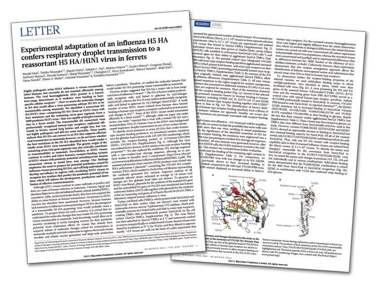 Ikerketa horietan, bi taldeek --Rotterdamgo Erasmus ikerketa medikorako zentrokoa bat eta Estatu Batuetako Wisconsin-Madison Unibertsitatekoa bestea-- H5N1 hegazti-gripearen aldaerak sortu dituzte mutazioz laborategian, eta ikusi dute aldaera berriak gai izan direla hudoak arnasbideetatik kutsatzeko. Arnasbideetatik kutsatzen den giza gripearen azterketak egiteko eredurik onena dira hudoak, eta, ondorioz, emaitzak kezkagarriak dira: oso mutazio gutxiren bidez eskuratu dute aldaerek gaitasuna, eta aditzera ematen dute hegaztien H5N1 birusak aurreikusi baino aukera handiagoa izan dezakeela gizakien artean gripe-pandemia eragiteko.