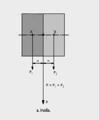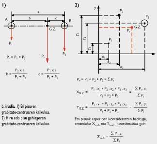 Kararriak, bolumen berean urak baino 2,6 aldiz gehiago pisatzen duela esan nahi du horrek. Grabitate-zentrua. Gorputz homogenoak eta heterogenoak Badakigu edozein gorputzi Lurrak bere zentru aldera erakarrita indarra (grabitate-indarra edo pisua) eragiten diola. Grabitate-indarra gorputzaren zati guztietan eragiten da. Grabitate-zentrua, gorputz batean eragiten duten grabitate-indar partzial guztien erresultantearen aplikagunea da. Berunezko lamina karratu bat baldin badugu, adibidez, eta bere bi zati (A eta B) kontsideratzen baditugu (ikus a. irudia), A zatian Lurrak P 1 indarra eragiten du behera eta B zatian P 2 indarra. Bi indar horiek kontsideratzeak edo karratuaren zentruan (grabitate-zentruan) P indarra kontsideratzeak berdin dio, baldin eta P = P 1 + P 2 baldin bada. P indarra da indar erresultantea eta karratuaren zentrua indar erresultantearen aplikagunea. P 1 eta P 2 indarrak berdinak izango dira, baldin A eta B zatiek azalera berdina badute eta A eta B zatiak material berdinaz eginda badaude (bestela esan, karratu osoa material homogenoz egina badago). Besterik litzateke karratuaren A alderdia material batez (berunez, adibidez) eta B alderdia beste batez (paperez, esaterako) eginak baleude, alde bateko eta besteko pisu espezifikoak desberdinak direlako. Karratua material heterogenoz egina dagoela esango dugu kasu horretan. Plazan jasotzeko erabiltzen den granitozko harriak bere barruan, adibidez, beste pisu espezifiko bat duen mineralezko betak baldin baditu, Fisikan material heterogenoa dela esaten da. Material homogenoz egindako gorputz geometrikoen grabitate-zentrua non dagoen jakitea erraza da. Harrizko esfera homogenoaren (hau da, esferako puntu guztietan harriak pisu espezifiko bera duenean) grabitate-zentrua, esferaren zentru geometrikoan dago. Harri kubiko homogenoaren grabitate-zentrua, kuboaren zentru geometrikoan dago.