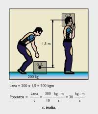 Lurrak pisu espezifiko desberdineko bi esfera horiei eragindako P 1 eta P 2 indarren ordez bi horien Pr indar erresultante bakarra ipinita efektu berbera lortuko dugu. Baina, hori bai, indar erresultanteak beste bien batura izan behar du eta indar erresultantearen aplikaguneak irudian adierazitako G.Z. puntuan egon behar du (grabitate-zentruan, alegia). Aplikagunea A gorputzetik b distantziara dago eta B gorputzetik c distantziara. b eta c distantziak kalkulatzeko formulak irudian bertan erakusten dira. b2. irudian, pisu espezifiko desberdineko hiru pisuren erresultantea (P r ) eta beren grabitate-zentrua (G.Z.) nola kalkulatu erakusten da. Bide batez, pisu gehiagoren erresultantea eta grabitate-zentrua nola lor daitezkeen ere erakusten da. Indarra, lana eta potentzia Pisua gure kasuan, Lurrak harriari beherantz eragiten dion erakarmen-indarra da, eta harrijasotzaileak 100 kilo pisatzen duen harriari erori gabe eutsi nahi badio, gorantz 100 kiloko indarra eragin beharko dio bere grabitate-zentruan. Harriari bere horretan geldirik eusten badio, Fisikaren ikuspegitik harrijasotzaileak ez du lanik egin. Fisikan lana egon dadin, gorputza (harria kasu honetan) indarra eraginda desplazatu egin behar da. Lana berriz, honela definitzen da Fisikan: eragiten den indarra bider gorputzaren desplazamendua. Pentsa dezagun c. irudian harrijasotzaile batek 200 kiloko pisua duen harri kubikoa bizkarrera altxatu behar duela. Harria lurretik bizkar gaineraino altxatu du eta harriaren grabitate-zentrua ere igo egin da. Lurretik bizkar gaineraino harriaren grabitate-zentruak 1,5 metro egin du gora. Kasu horretan Fisikan harrijasotzaileak 200 kg bider 1,5 metro edo 300 kilogrametroko (kg x m-ko) lana egin duela esaten da. Lana beraz, indarra bider distantzia da. Hemen esandakotik erraz ikus daiteke harriak lurrean dagoenean bere grabitate zentrua zenbat eta gorago eduki, harrijasotzaileak bizkarreraino altxatzeko hainbat eta lan gutxiago egin behar duela. Izan ere, bizkarrerainoko distantzia 1,5 metro baino txikiagoa izango litzateke, eta esan dugunez lana pisua (edo indarra) bider distantzia da. Beraz, pisu bera eta distantzia txikiagoa izango luke. Harrijasotzailea mozkotea edo txikia bada ere, abantaila du. Izan ere, harria lurretik bizkarreraino jaso behar du eta bizkarra harrijasotzaile altuak baino beherago duenez, 1,5 metroko distantzia hori txikiagoa litzateke eta egindako lana (indarra edo pisua bider distantzia) ere bai. Guk, egia esan, beste kiroletan ere ikusten ditugu horrelako kasuak. Atletismoan altuera-jauzian adibidez, bi metroko altuera nekez saltatuko du metro t’erdiko gizon edo emakumeak. Harrijasotzean ere berdin gertatzen da: indarrez berdin dauden bi harrijasotzaile parean ipinita, lurretik sorbaldara distantzia txikiena duenak abantaila du. Fisikan potentzia berriz, denbora-unitateko egiten den lana da. c. irudiko harrijasotzaileak 200 kiloko harria hamar segundotan altxatzen badu, 300 kg x m/10 s-ko edo 30 kg x m/s-ko potentzia erabili duela esaten da. Batzuetan potentzia kg x m/s-tan eman ordez watt (W) edo zaldi-potentziatan (ZP) ematen da. Esan dezagun, bada, 1 kg x m/s = 9,807 watt = 1,315 x 10 -2 ZP dela.  Zenbait materialen pisu eskezifiko erlatiboak