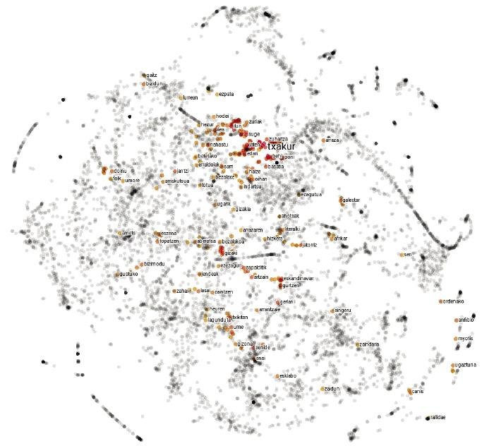 Baina bada zerbait errezeta honetan falta dena. Izan ere, arestian aipaturiko 300 dimentsioek asko baziruditen ere, prozedura honek dozenaka mila dimentsioko mapak sortuko lituzke, hizkuntzak hitz adina zenbakiz osatuko baitira bertako koordenatuak. Nola murriztu, bada, dimentsio-kopurua? Erantzuna ez zaigu oso arrotza: gure mapa arruntek ere bi dimentsio izan ohi dituzte, nahiz eta errealitatean hiru dimentsioko mundu bat adierazi. Hain zuzen ere, mapak sortzean, kanpoan utzi ohi da altueraren dimentsioa, ez baita batere esanguratsua hirien arteko distantziak kalkulatzerako garaian. Hizkuntzen mapekin ere antzeko zerbait egiten da: hainbat teknika matematiko erabiliz, aldakortasun handieneko ardatzak (esanguratsuenak direnak) identifikatzen dira, eta gainerako dimentsioak mapatik kanpo uzten. Maiztasunaren efektua zuzentzeko moldaketa batzuk gorabehera, horixe da, hain justu ere, embeddingak ikasteko zenbaketa-tekniken atzean dagoen oinarrizko ideia [3]; kontuan izan ikasketa automatikoan oinarritutako teknikek [11, 4] modu inplizituan egiten dutela prozedura bera [10].