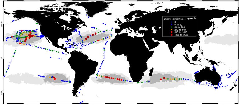 Ozeanoetan hondakin plastikoen bost eremu handi daude, eta eremu horiek bat egiten dute azaleko uren zirkulazio-aldaketekin. Hori da Malaspina espedizioak (CSIC) argitara eman duen azken ikerketaren ondorio nagusia. Hain zuzen, Cadizeko Unibertsitateak gidatuta, artikulu bat argitaratu dute PNAS aldizkarian, eta han agerian utzi dute Ozeano Barearen iparraldeko biltegiaren antzekoak daudela baita Ozeano Barearen hegoaldean, Ipar Atlantikoaren erdialdean, Hego Atlantikoan eta Indiako Ozeanoan.