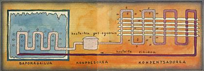 HOZKAILUAHozkailua, beroa mugi erazten duen makina da. Barneko beroa kanporatuz, tenperatura jaistea lortzen du. Kanporatutako bero hori, kanpoko airea berotu eta galdu egiten da. Hozkailuek lurrinketa bidez funtzionatzen dute. Likidoak, baporatu edo lurrintzean, beroa galdu eta hoztu egiten dira. Baporagailua Likido hoztailea presio baxuan ateratzen da espantsio-balbulatik hodira eta lurrindu egiten da hoztuz. Baporagailua hozkailuaren barruan dagoenez, bertako beroa jasotzen du hoztaileak lurrintzen denean. Konpresorea Hozkailu elektrikoek, hoztailea zirkularazten duen konpresore bat dute. Konpresoreak hoztailea baporagailutik kondentsadorera ponpatzen du. Kondentsadorea Hoztailea presio handian ateratzen da konpresoretik. Kondentsadorean zehar iragan ahala lurrin hori likidotu egiten da berriro. Hau gertatzen den bitartean lurrinak beroa askatzen du eta beraz kondentsadorea berotu egiten da. Kondentsadorea hozkailuaren atzekaldean egoten da eta bero hori inguruko airera kanporatzen da. |