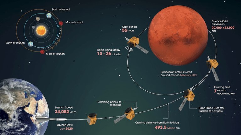 Egun hauetan Martera iristekoak diren hiru misioetako lehena da. Gaur bertan orbitan sartzekoa da Tianwen-1 misio txinatarra, eta otsailaren 18an iritsiko da Mars2020 NASAren misioa. Arabiarrak ez bezala, bi horiek Marten lur hartzea dute helburu.