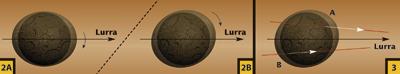 Ondorioa ikusgarria da (3 irudia): Lurrak Ilargia erakartzen duenean, A aldeko indarrak Ilargia erlojuaren orratzen aldera birarazteko joera du, eta B aldeko indarrak, ordea, Ilargia erlojuaren orratzen aurka biraraztekoa. A aldeko indarra zertxobait handiagoa da, Lurretik hurbilago dagoelako, eta horrek eragiten du Lurrak Ilargiari erlojuaren orratzen aldera biraraztea, edo bestela esanda, moteldu egiten du Ilargiaren errotazioa.