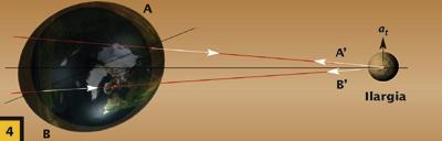 Aurreko atalean erakutsi den bezala, Lurrak Ilargiari eragiten dion efektu bera egiten dio Ilargiak Lurrari ere: errotazioa moteltzea. 4 irudiak erakusten ditu, ezkerrean, Lurra, eta Ilargiak Lurrari eragiten dizkion indarrak (A eta B). Bi indar horiek dira Lurraren errotazioa moteltzen ari direnak, aurreko atalean aipatu den bezala.