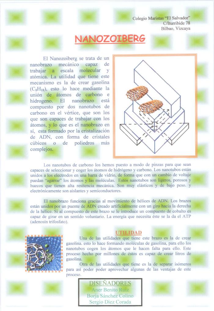 Irabazleek egindako horma-irudian azaltzen denaren arabera, nanohodiz eratutako "Nanozoiberg" batek gasolina sintetizatuko du karbono-atomoetatik abiatuta.