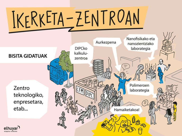 Deskribapena: Materialen Fisika Zentroan (CFM, CSIC-UPV/EHU) eta Donostia International Physics Centerren (DIPC) urtero jartzen dituzte martxan Gipuzkoako eskolei bideratutako bisitak. 14 bisita programatzen dira, eta 500 ikasle inguru jasotzen dituzte zentro horietan.