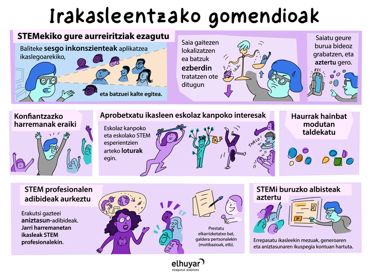 - STEM profesionalen adibideak aurkeztu: STEM profesionalak ezagutzeak eurekiko izan ditzaketen aurreiritziak apurtzen laguntzen du. Gomendagarria da perfil anitzeko profesionalak ekartzea: biologoak, ingeniariak, sendagileak… Bisita jaso aurretik profesionalaren inguruan dokumentatzeak eta taldeetan elkarrizketatxoa prestatzeak bizipen honen eragin positiboa areagotu dezake.