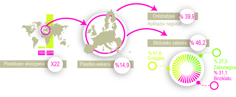 Merkea, eraldatzeko erraza, iraunkorra, arina eta erabilera anizkoitzekoa denez, mundu mailako plastikoen ekoizpenak izugarri gora egin du, azken 52 urteotan. 1964. urtean, 15 milioi tona (MT) plastiko sortu ziren, eta 2016. urtean, aldiz, 335 MT, hau da, 22 bider gehiago. Europan, plastikoen eskaria 49,9 MT-koa izan zen, eta gehienbat ontziratze-aplikazioetarako bideratu zen lehengaia. Ekoitzitako plastiko-produktuetatik sortutako zaborraren % 42,6 bakarrik bildu zen, eta kantitate horretatik, % 41,6 erregai gisa erabili zen, % 27,3 zabortegietara bideratu zen eta % 31,1 birziklatu egin zen (1. irudia).