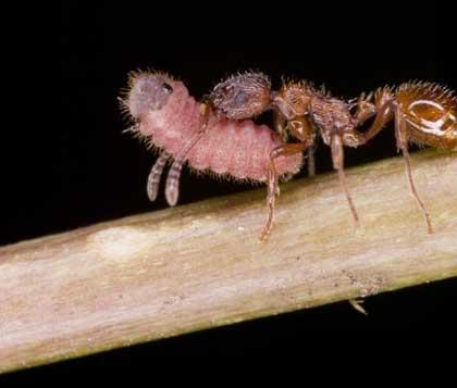 Es la mariposa en la que está especializada; cuanto mejor sea la simulación, más éxito tendrá. Si quiere perdurar tiene que engañar a la hormiga. Pero para la hormiga la mariposa es parásita, por lo que tiene que separar los dos tipos de oruga. Para ello, la química superficial de las hormigas cambia.