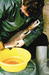 La época de fecundación suele durar entre diciembre y enero y normalmente las hembras de salmón se reproducen una sola vez a lo largo de toda la vida. Los salmones se reproducen en zonas poco profundas de guijarros. Las hembras con sus colas mueven las piedras y realizan un cepillo bajo la piedra. La fase embrionaria larva dura aproximadamente tres meses, hasta marzo. El principal riesgo en esta fase es que las partículas que se encuentran en el esquí en el agua colmatan el cepillo y ahogan los huevos, pisando tractores y montañeros.